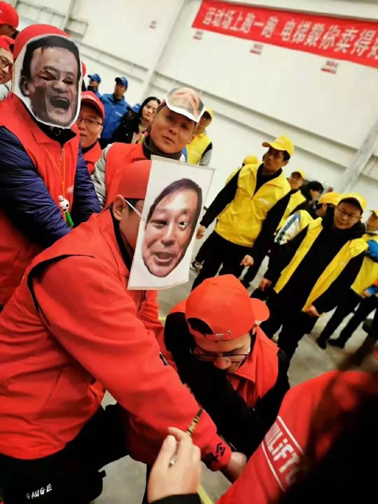 拔河比賽臨開始之際,兩隊劍拔弩張,裁判正要吹哨,其中一邊的“紅星隊”,突然變魔術(shù)一樣,從帽子上拉下來一組面具,"郭德綱"、"姚明"、"馬云"、"王寶強"、"小岳岳"、"馬保國"、"如花"……咦,這是來拔河的嗎?