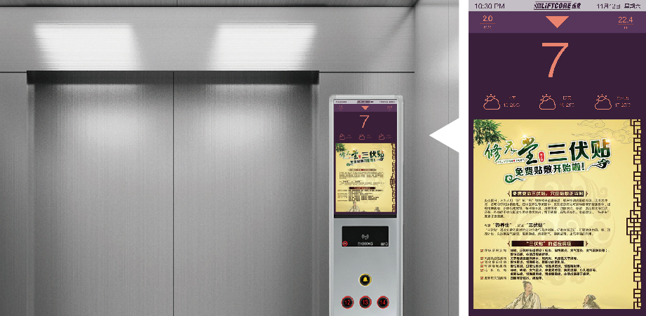 轎廂內(nèi)配18.5英寸大屏液晶顯示,在滿足樓層運行方向指引外,還可以顯示天氣、日期和時間,也可以通過圖片和視頻顯示醫(yī)院信息、通知和醫(yī)院小常識等。