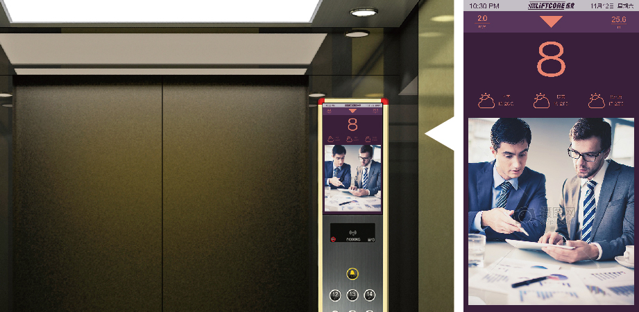轎廂內(nèi)配18.5吋大屏液晶顯示,可播放商業(yè)資訊、企業(yè)宣傳等圖片和視頻,同時(shí)顯示天氣、日期和實(shí)時(shí)資訊等,為商務(wù)精英的出行預(yù)知天氣、路況;觸摸顯示樓層信息,使商務(wù)合作伙伴能更快鎖定樓層;國(guó)際化設(shè)計(jì)師提供豐富的設(shè)計(jì)裝潢,展示與國(guó)際接軌的企業(yè)形象。