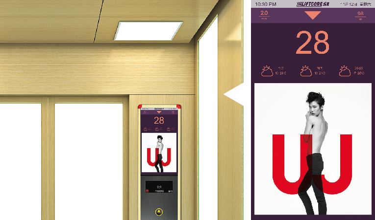 轎廂內(nèi)搭配超過18.5寸的大屏液晶顯示,在線播放圖片、視頻以及對應(yīng)場所資訊,利用互聯(lián)網(wǎng)技術(shù)實現(xiàn)在線宣傳推送,吸引客戶、廣告商等進(jìn)行廣告投放,帶來豐厚的經(jīng)濟(jì)效益。
