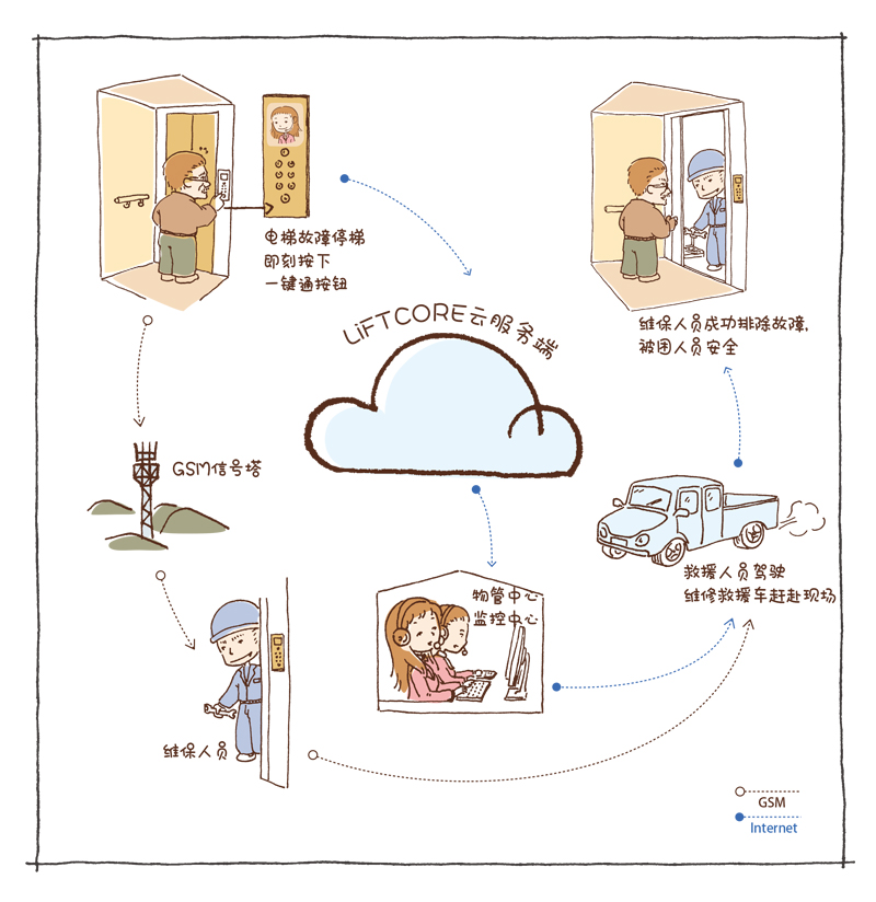 LCTAS一鍵通遠程協(xié)助系統(tǒng) •當發(fā)生故障或乘客需要協(xié)助時,乘客可以按下轎內(nèi)的“一鍵通”按鈕,LCTAS為乘客提供緊急協(xié)助。 •LCTAS通過同時使用互聯(lián)網(wǎng)和GSM移動通信網(wǎng)絡,呼叫預先在系統(tǒng)里設定先后順序的10個聯(lián)系人(物管中心或監(jiān)控中心或維保人員)。 •轎廂內(nèi)的LCD顯示屏可先發(fā)出視頻呼叫。 •遠程協(xié)助系統(tǒng)能夠獲取電梯的狀態(tài),故障前最后狀態(tài)的獲得,有助于維修分析和工具的準備. •系統(tǒng)擁有遠程值守功能,系統(tǒng)自動進行安全檢測,將檢測結果上報到遠程系統(tǒng),預防故障發(fā)生。 ![]() |
